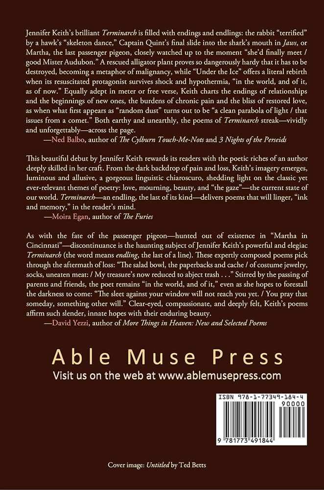 Jennifer Keith’s brilliant Terminarch is filled with endings and endlings: the rabbit “terrified” by a hawk’s “skeleton dance,” Captain Quint’s final slide into the shark’s mouth in Jaws, or Martha, the last passenger pigeon, closely watched up to the moment “she’d finally meet / good Mister Audubon.” A rescued alligator plant proves so dangerously hardy that it has to be destroyed, becoming a metaphor of malignancy, while “Under the Ice” offers a literal rebirth when its resuscitated protagonist survives shock and hypothermia, “in the world, and of it, as of now.” Equally adept in meter or free verse, Keith charts the endings of relationships and the beginnings of new ones, the burdens of chronic pain and the bliss of restored love, as when what first appears as “random dust” turns out to be “a clean parabola of light / that issues from a comet.” Both earthy and unearthly, the poems of Terminarch streak—vividly and unforgettably—across the page.— Ned Balbo, author of The Cylburn Touch-Me-Nots and 3 Nights of the PerseidsThis beautiful debut by Jennifer Keith rewards its readers with the poetic riches of an author deeply skilled in her craft. From the dark backdrop of pain and loss, Keith’s imagery emerges, luminous and allusive, a gorgeous linguistic chiaroscuro, shedding light on the classic yet ever-relevant themes of poetry: love, mourning, beauty, and “the gaze”—the current state of our world. Terminarch—an endling, the last of its kind—delivers poems that will linger, “ink and memory,” in the reader’s mind.— Moira Egan, author of The FuriesAs with the fate of the passenger pigeon—hunted out of existence in “Martha in Cincinnati”—discontinuance is the haunting subject of Jennifer Keith’s powerful and elegiac Terminarch (the word means endling, the last of a line). These expertly composed poems pick through the aftermath of loss: “The salad bowl, the paperbacks and cache / of costume jewelry, socks, uneaten meat: / My treasure’s now reduced to abject trash . . .” Stirred by the passing of parents and friends, the poet remains “in the world, and of it,” even as she hopes to forestall the darkness to come: “The sleet against your window will not reach you yet. / You pray that someday, something other will.” Clear-eyed, compassionate, and deeply felt, Keith’s poems affirm such slender, innate hopes with their enduring beauty.— David Yezzi, author of More Things in Heaven: New and Selected Poems
