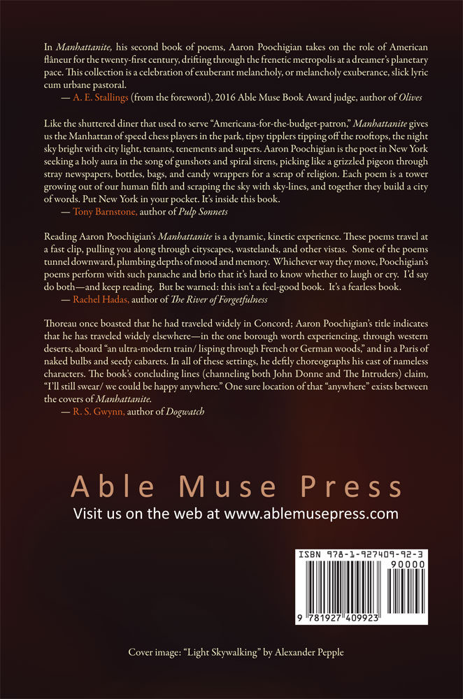 Like the shuttered diner that used to serve “Americana-for-the-budget-patron,” Manhattanite gives us the Manhattan of speed chess players in the park, tipsy tipplers tipping off the rooftops, the night sky bright with city light, tenants, tenements and supers. Aaron Poochigian is the poet in New York seeking a holy aura in the song of gunshots and spiral sirens, picking like a grizzled pigeon through stray newspapers, bottles, bags, and candy wrappers for a scrap of religion. Each poem is a tower growing out of our human filth and scraping the sky with sky-lines, and together they build a city of words. Put New York in your pocket. It’s inside this book.
