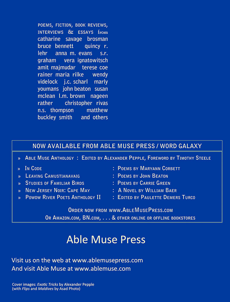 "Able Muse is refreshing to read for its selection of poetry that adheres to form . . . a quality magazine offering the reader informed and unexpected views on life."-NewPages.