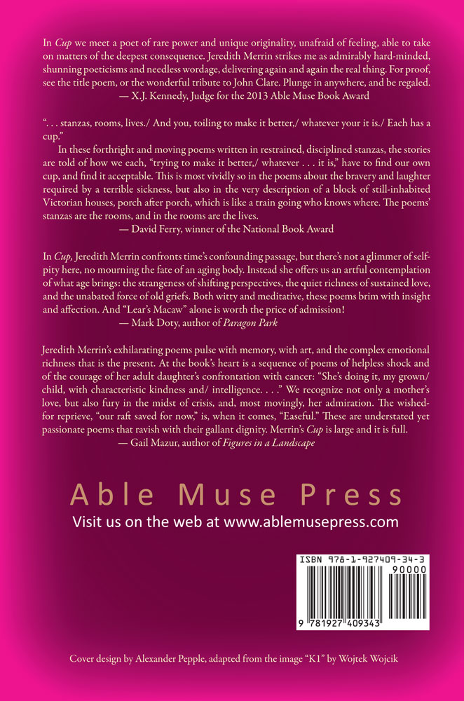 In Cup we meet a poet of rare power and unique originality, unafraid of feeling, able to take on matters of the deepest consequence. Jeredith Merrin strikes me as admirably hard-minded, shunning poeticisms and needless wordage, delivering again and again the real thing. For proof, see the title poem, or the wonderful tribute to John Clare. Plunge in anywhere, and be regaled.