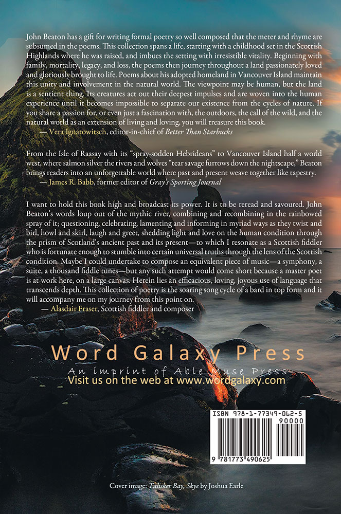 John Beaton has a gift for writing formal poetry so well composed that the meter and rhyme are subsumed in the poems. This collection spans a life, starting with a childhood set in the Scottish Highlands where he was raised, and imbues the setting with irresistible vitality. Beginning with family, mortality, legacy, and loss, the poems then journey throughout a land passionately loved and gloriously brought to life. Poems about his adopted homeland in Vancouver Island maintain this unity and involvement in the natural world. The viewpoint may be human, but the land is a sentient thing. Its creatures act out their deepest impulses and are woven into the human experience until it becomes impossible to separate our existence from the cycles of nature. If you share a passion for, or even just a fascination with, the outdoors, the call of the wild, and the natural world as an extension of living and loving, you will treasure this book.