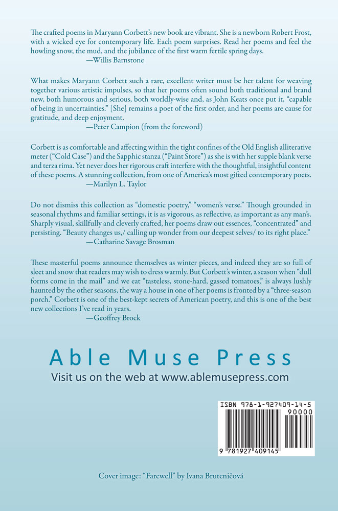 The crafted poems in Maryann Corbett’s new book are vibrant. She is a newborn Robert Frost, with a wicked eye for contemporary life. Each poem surprises. Read her poems and feel the howling snow, the mud, and the jubilance of the first warm fertile spring days.