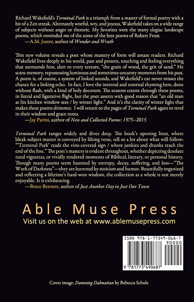 This new volume reveals a poet whose mastery of form will amaze readers. Richard Wakefield lives deeply in his world, past and present, touching and feeling everything that surrounds him, alert to every texture, “the grain of wood, the grit of sand.” He scans memory, repossessing luminous and sometimes uncanny moments from his past. A poem is, of course, a system of linked sounds, and Wakefield’s ear never misses the chance for a linking echo. In fact, I love the internal and external rhyming here, done without flash, with a kind of holy decorum. The seasons course through these poems, in literal and figurative flight, but the poet asserts with good reason that “an old man at his kitchen window sees / by winter light.” And it’s the clarity of winter light that makes these poems shimmer. I will return to the pages of Terminal Park again to revel in their wisdom and grace notes.