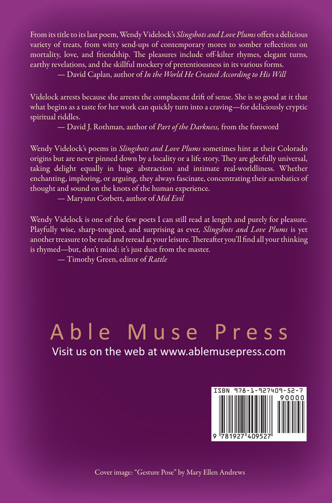 From its title to its last poem, Wendy Videlock’s Slingshots and Love Plums offers a delicious variety of treats, from witty send-ups of contemporary mores to somber reflections on mortality, love, and friendship. The pleasures include off-kilter rhymes, elegant turns, earthy revelations, and the skillful mockery of pretentiousness in its various forms.